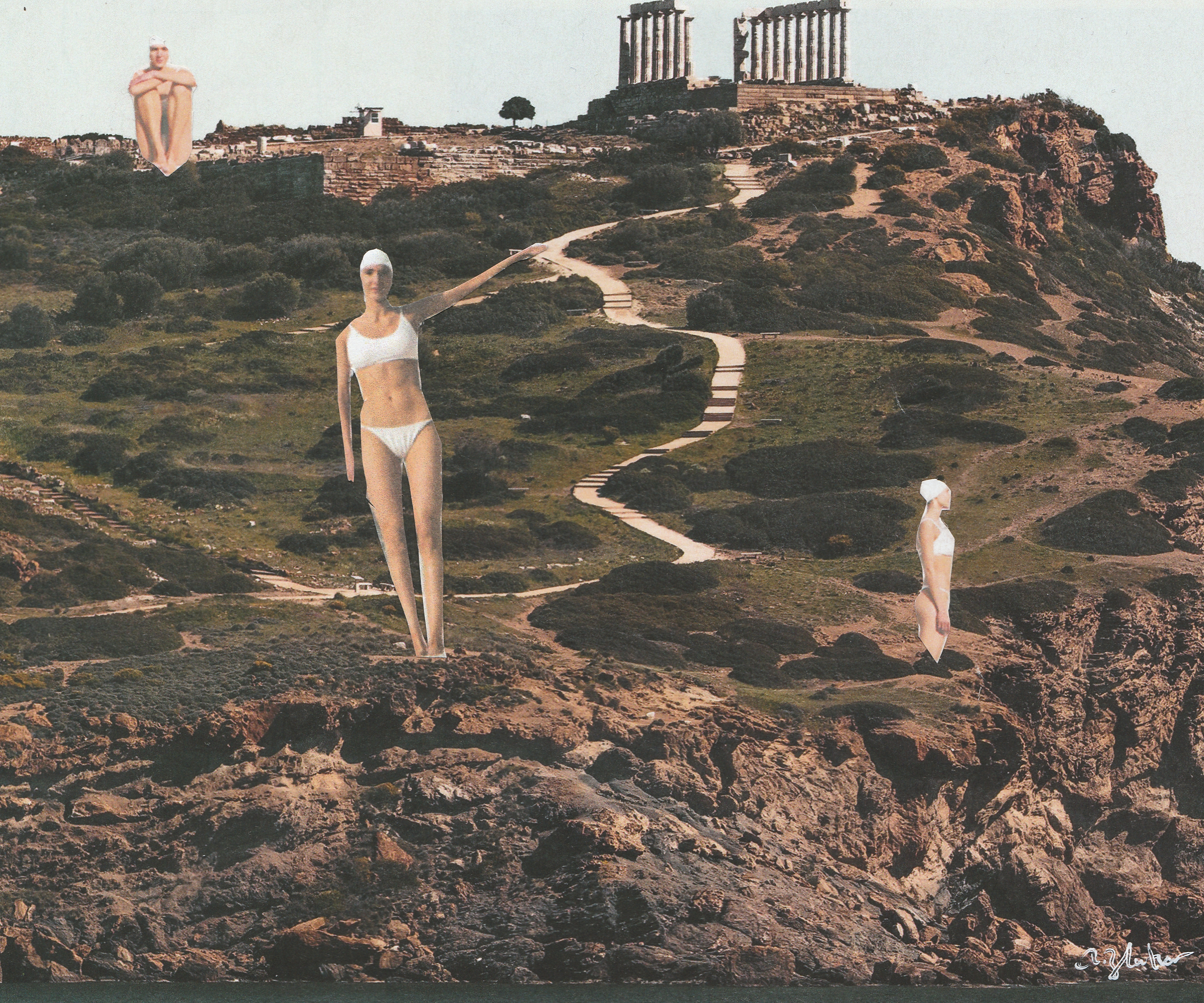 These collages explore the uneasy tension between human leisure, environmental degradation, and cultural preservation. To me, the works symbolise the unseen ecological crises polluting our waterways. Interwoven throughout the composition are fragments of UNESCO World Heritage Sites that are all at risk due to our overconsumption. The paradox of luxurious swimmers and human affairs and environmental degradation highlights how pivotal our role is in conservation and heritage management are intrinsically connected to environmental justice.